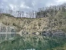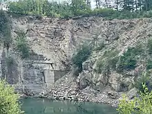 The Schevenhütte quarry is a former slate quarry in Stolberg-Schevenhütte. Unique Schevenhütte natural stone was quarried here presumably from the Middle Ages until 2008. In the 20th century until it was closed down, the quarry was called "Kaspar Müller I Quarry". It is located on the northern edge of the Eifel at the southern end of Schevenhütte. Geologically, it is part of the outermost foothills of the Venn saddle, where very old rocks from the latest Ordovician period are exposed. These rocks are the oldest in North Rhine-Westphalia. As a special feature, the so-called "Schevenhütter Schichten" (Schevenhütte strata) dip very straight in the quarry area and were thus worth mining. "Schevenhütter Naturstein" was quarried mainly in two varieties, a greenish and a red variety. Basically, the stone from the middle and upper Wehebach layers was roughly processed and sold on site. The "Schevenhütter Schiefer" (Schevenhütte Slate) was used in a variety of ways throughout the region, including as ornamental and rough building material, but also as walking slabs and as gravestones.