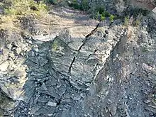 The strata were already deformed during the Kalendonian mountain building in the Silurian and then, clearly visible through tectonic structures, again during the Variscan mountain building in the Carboniferous.[1] The tectonic deformations are particularly well visible along the scarp of the L25 in Schevenhütte, for about 300 m north of the quarry. This rock formation is also a registered archaeological monument. There are mainly north-vergent folds and thrusts dipping to the south. The fold axes run W-E, the slate rock of the Wehebach strata dips S there. The quarry, which is only about 30 metres higher, is clearly less folded. The strata of siltstone and banded schist found here show weak bending of their bedding planes in contrast to the shale-sandstone sequences along the road.[5]