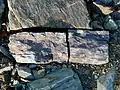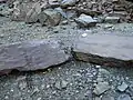 The reddish-purple, more clayey Bänderschiefer without sandy parts tends to be exposed in the upper layers. The red colour is due to an increased manganese oxide and haematite content, which in turn were caused by submarine volcanic ejections and could sediment particularly well at this location. Individual layers of fine sand wedge out of the banded shales, creating a characteristic flashlayer. This can be seen as graded fine stratification on the surfaces of the rocks (see pictures). A very dense bioturbation prevails. Sedimentation of the ribbon shale occurred on a shallow marine delta platform.[5]