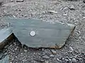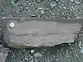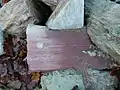 Within the strata of SM2, the quarried siltstone is found in two different predominant forms, which differ mainly in their sandstone content. The greener variety is also called banded shale and is dominated by fine sand- and silt-streaked mudstones, in some of which sandstone beds can be found. Next to it is a redder, more clayey variant without sandstones.[4][5] The clayey variant increases towards the top and thus the red colouring also becomes stronger. These layers of the Upper Salm occur once more to the south at the headwaters of the Thönbach (a tributary of the Wehebachtalsperre). Thus, the occurrence in this form is limited to the synclinories of the Wehe and the Thönbach.[5] The red colouration of the rock is not completely clarified, although much points to a stronger haematite and manganese oxide content, as solution from the overlying colourful Gedinne layer is no longer considered likely today.[6][7]