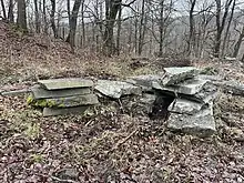 The course and ownership of the quarry after the Second World War are also unclear. Kaspar Müller presumably took over the quarry operations around the 1950s. From then on, the operation also bore the name "Kaspar Müller I Quarry". At the beginning of the 1980s, he finally bought the quarry site from Laufenburg GmbH. In the 1960s, up to 60 employees were employed and 600-900 t of material were quarried per month; in the 1950s, there were still only about 30 employees and 400-450 t.[6] Quarrying became more and more motorised and the demands on the products also changed several times over the years (see below), but on 30 June 2008 active operations ended at the Kaspar Müller I quarry. The stockpile of stone slabs continued until August 2011. With the cessation of work, the mucking measures in the quarry basin also ended. the site was not left in an orderly manner. The buildings were left unchanged, and the site was neither renaturalised nor secured against rockfalls.