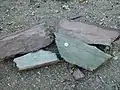 Primarily two varieties of ornamental rock were mined and processed. Even if the lithological description and naming is not quite clean, the commonly used names are given. The grey-green fibrous siltstone is popularly called "Tonschiefer" (clay shale); the red-purple one is called Bänderschiefer (banded shale).[5]