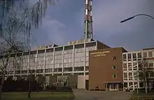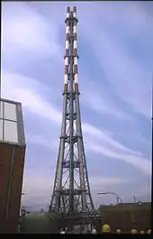 Due to the use of heavy fuel oil, a chimney was built with a height of 722 feet or 220 metres, it was 1962-1965 the tallest chimney worldwide. It was an open lattice structure with three separate exhaust pipes from the blocks. The structure was demolished in 2005.[1]