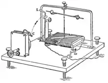 Each needle was hung above its coil horizontally by a silk thread. A paper disc was attached to the thread coloured white on one side and black on the other. When the coil was energised, either the black side or the white side would turn towards the observer, depending on the polarity of the applied current.[3] In some models, Schilling attached a platinum-plated wire to the thread which descended into a container of mercury. The end of the wire in the mercury was paddle shaped so that the motion of the needle was damped and oscillation suppressed.[4] Two permanently magnetised steel pins were screwed into the wooden base to hold the needle in the neutral position, that is, so that the paper disc was edge on, not displaying a colour. A second needle underneath the coil was used for better linking with these permanent magnets.[5]