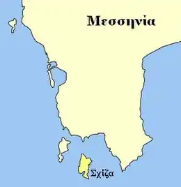 Schiza (Greek: Σχίζα) is a Greek island off the southwestern coast of the Peloponnese. According to 2011 census, the island is uninhabited. Administratively it is part of the municipality of Pylos-Nestor in Messenia. It is the largest island of the Messenian Oinousses, an island complex that consists of two main islands (Schiza and Sapientza) and few rocky islets. Its area is 12.3 Km2. Schiza along with other Messenian Oinousses have been included in the Natura 2000 Network, with code GR2550003.[1]