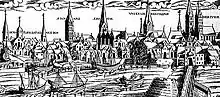 The appearance of the Schlachte on the woodcut (pictured) from c. 1550 clearly shows a quayside with timber reinforcement although a little later a stone structure was substituted. In 1557, the Schlachte officially became part of the city of Bremen. From 1600 to 1830, there was little change in the appearance of the Schlachte and the rare changes harbour equipment were to the great cranes. It stretched 450 m (1,480 ft) from St Martini Church to the Kornhaus. On the town side, it was bordered by a row of half-timbered houses.[7]