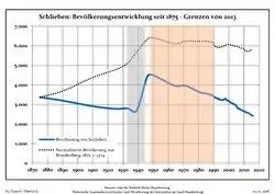 Development of Population since 1875 within the Current Boundaries (Blue Line: Population; Dotted Line: Comparison to Population Development of Brandenburg state; Grey Background: Time of Nazi rule; Red Background: Time of Communist rule)