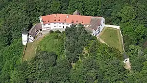 It was the seat of a Hofmark (a lower legal entity) during the Palatinate-Sulzbach period (16th–18th centuries). The castle, with its 165 hectares of forest and meadows, is now part of the Schergenbuck reserve.[1] Neidstein was the residence of the Brandt family since 1466. In 1979, the castle was inherited by the American administrative law judge Theodor P. Von Brand from his uncle Dr. Philipp Theodor Freiherr von Brand. After his death in 2004, the von Brand heirs sold the castle in 2006 to the actor Nicolas Cage. In 2009, Cage sold the castle to a lawyer in Amberg.[2] The castle was carefully modernised and is now used as a venue for workshops and conferences e.g. by the Fraunhofer Society.[3]