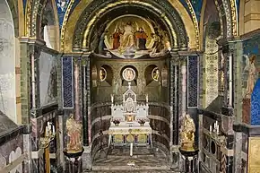 The architect kept the facade neo-Baroque, matching the main building, but based the interior on Romanesque models, with rich decorations. Almost 90 different kinds of marble were used for floor and walls. The altar was built from Carrara marble, porphyr, onyx and alabaster. Paintings for walls and ceilings were created by Franz Guillery, mosaics by the Cologne workshop Peter Bayer, and furnishings were designed by the sculptor Wilhelm Albermann and the goldsmith Gabriel Hermeling. The ceiling of the apse shows Jesus enthroned, with Maria and Johannes. A rose window to the west represents Elisabeth's most famous miracle, the Miracle of the roses.[1]