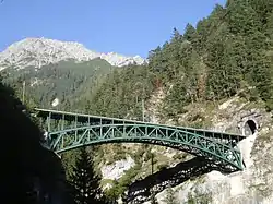 The Schlossbach rises below the Reither Spitze in the municipality of Reith bei Seefeld and flows in a north to south direction. After around 1.5 km (0.93 mi) it collects the river Grieskarbach from the left. In its upper reaches is a gorge, the Schlossbachklamm (location: 47°17′49″N 11°14′20″E / 47.297059°N 11.238778°E[2]). This is traversed at a height of 60 metres (200 ft) by the Schlossbach Bridge which carries the track of the Mittenwald Railway. The railway bridge is a 66-metre-long (217 ft),[3] trussed arch structure made of steel and a popular photograph subject.