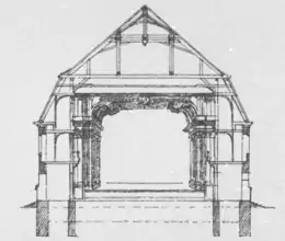 Karl Theodor, the Pfalzgraf who resided in Mannheim, had the theater built for his summer residence in Schwetzingen in 1752 to the plans of court architect Nicolas de Pigage.[1] It was opened on 15 June 1753, presenting Ignaz Holzbauer's opera Il figlio delle selve.[2] The theater could then be considered a rococo creation, but was expanded with early neoclassical tendencies. While it first had no boxes, it was enlarged in 1762, creating a "box-like" impression. It is the oldest surviving Rangtheater (theater with boxless tiers) in Europe.[3] The Mozart family visited the theater in 1763 and saw a play.[1][4] When Karl Theodor succeeded Maximilian III Joseph of Bavaria as Elector of Bavaria in 1777, the court had to move to Munich and the theater lost its importance. Its original stage machinery was preserved into the 20th century, but it was replaced by modern facilities in the 1950s and again in the 1970s.