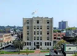 The former Schlotterbeck and Foss building is located on the north side of Portland's downtown area, at the southeast corner of Preble and Kennebec Streets. The building is a five-story masonry structure, with a concrete frame and an exterior of buff brick with cast stone. The ground floor is finished in cast stone, while the upper floors are primarily brick with stone trim. The central three bays project slightly, and the main entrance at its base is sheltered by a metal canopy supported by chains. The building corners also project in the manner of pilasters, and have decorative Art Deco details in the top level. Its facade is topped by a low parapet with stepped caps at the corners.[2]