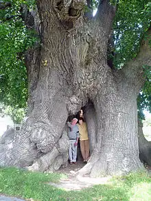 The lime tree stands at approximately 24 meters in height with a crown diameter of around 20 meters.[8] Prior to losing part of its crown in a storm in 1884, it was 44 meters high.[7] The trunk of the tree features two gate-like openings on one side, leading to interconnected cavities that can accommodate up to 15 people.[4] Adventitious stems have emerged in these cavities, providing nutrients to various parts of the crown. The inner walls of the trunk cavity are covered with new bark, a unique characteristic of linden trees.[3] The trunk cavity extends into seven individual trunks. Large branches form a dense, foliage-rich crown at a height of four meters, despite the damage incurred at the end of the 19th century.[3] The strong branches of the crown are connected to each other using a flexible belt system, ensuring the prevention of branch breakage. This dynamic securing allows for natural crown movement while gently restraining excessive motion.