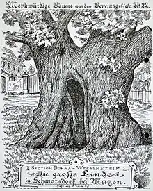 In the magazine there is a picture of the Linden tree, created based on a photograph taken by Th. Kirsten in Dresden.[11] Additionally, the local museum of Maxen has an artistically oil painted picture, based on the same photograph.[4] The picture is supposed to show the lime tree before the storm event of 1884. However, some sources describe the image as depicting the tree’s condition after the 1884 event.[3] A photograph from around 1900 shows that half of the tree’s crown consisted of shorter, young branches.[8] According to the mountain club Über Berg und Tal's logbook, on May 7, 1911, 40 members of the Society for Saxon History hiked from Malter to Ploschwitz via Reinhardtsgrimma and Maxen, via the Schmorsdorf lime tree.[12]