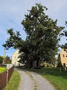 On July 31, 1939, the lime tree was officially designated as a natural monument under the Reich Nature Conservation Act (RNG) by the Dresden-Bautzen district government.[13] Toward the end of World War II, Soviet troops passed by the lime tree.[4] During a severe thunderstorm on July 24, 1957, a horizontally overhanging branch, called a bathtub and pointing south, broke off. This branch had a hollowed-out area where rainwater collected, creating a bathing spot for children.[6] The lime tree was designated as a natural monument two more times, on October 11, 1979, by the Pirna District Council (RdK) under the number 75-12/79, and on May 12, 1988, under the number 1129-115/88.[13] In 1991, experts performed crown protection by using wire ropes and caring for the bark. A gravel pad was placed over the root zone to provide better support for the Linden tree and a drainage system was installed. The restoration cost amounted to 8000 Marks.[4] In 1993, representatives from the forestry office and the Schutzgemeinschaft Deutscher Wald (Protective Association of the German Forest) inspected the lime tree. They determined a crown diameter of 21 meters and estimated its age to be around 600 years. Parts of the tree crown were pruned in 1997. In 2000, the steel securing of the crown from 1991, which was proved to be too rigid, was replaced by a flexible belt system, costing 2,760 marks. In 2004, the crown was shortened to prevent it from breaking due to its excessive size. The lime tree is inspected every two years for any signs of deterioration on behalf of the district office. Since 2006, the Lindenmuseum Clara Schumann has been in close proximity to the tree.[13]