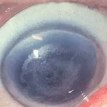 | Schnyder corneal dystrophy. Crystalline opacities are evident in the central cornea (Courtesy Dr. G.N. Foulks) | |