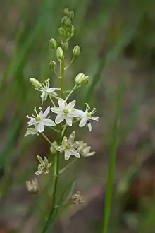 Schoenolirion wrightii, known as Texas sunnybell,[2] is a species of flowering plant in the Agave subfamily. It is native to the southern United States, in Texas, Louisiana, Arkansas, and Alabama.[3] Texas sunnybell produces vertical rootstocks topped with prominent bulbs, each up to 17 mm (0.67 in) in diameter. Between two and seven leaves are produced per plant, up to 34 cm (13 in) long and only 6 mm (0.24 in) across each, flattened to slightly keeled and usually shorter than the flowerhead. The ovate to lanceolate tepals are white with a green stripe on the back, mostly three-veined, but sometimes five-veined. Schoenolirion wrightii flowers between March and May, occurring in sandstone outcrops, wet pinelands, and boggy places.[3]