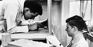 The first group of teachers included Linn Lovejoy Phelan[11] and Marianne Haile in ceramics, Alden Hewes Wood and Miss Sammy Tate in metalworking, Robert Frederic Heartz in weaving, Eva Crockett in textiles, and Ernest Brace in woodworking.[5][12] The first students were a Marine and a Seabee, veterans funded through the G.I. Bill.[5] Seabees were uniformed men who did construction work in combat areas as part of the United States Naval Construction Battalions.[13]