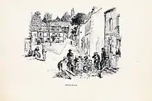 There were three hotels ready to accommodate visitors: the Hôtel de Voyageurs, the Hôtel du Lion d'Or and the Pension Gloanec. The Pension Gloanec, where Gauguin and his circle lodged, was especially cheap. When Blackburn visited it offered demi-pension, i.e. board, breakfast and evening meal with cider thrown in, for just sixty francs a month.[8] The artists were attracted by the beauty of the surrounding countryside and the low cost of living. Many of them were looking for a new point of departure, hoping to break away from the Academic style of the École des Beaux-Arts and from Impressionism which was beginning to decline. Brittany opened up new horizons with its language, traditional dress, fervent Catholic belief, an oral tradition and the ubiquitous presence of granite crosses and churches.[9]