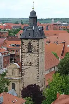 The three-aisled basilica is Romanesque in origin and partly Gothic in style. The Benedictine monastery was founded in 1136[2] by the brother of the Naumburg bishop Hildeward, Walther von Glisberg, whose gravestone is on display in the church. It shows the imperial ministerial, who was propertied at the Kunitzburg in Jena, and his wife in the style of Romanesque depictions of persons. He was also Vogt of his foundation.[2] The monastery was a branch monastery of the Abbey of St James in Regensburg, founded by Marianus Scottus, from which the present name Schottenkirche is derived (Schotten is German for "Scots"). By 1200, the building work was completed and the monastery church finished. In the early 13th century, the western nave bay was replaced by Early Gothic arcades.[3] First in 1299, then again in 1472, the great Erfurt city fire destroyed parts of the church, which were subsequently rebuilt in Gothic forms, reusing some of the old stones which are still distinguishable today.[3] Various architectural and decorative elements refer to the Iro-Scottish origin. The choir shows Gothic forms from the time after the second church fire in 1472.