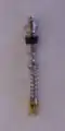 A Schrader valve consists of an externally threaded hollow cylindrical metal tube, typically nickel-plated brass. In the center of the exterior end is a metal pin aligned with the long axis of the tube; the pin's end is approximately flush with the end of the valve body.