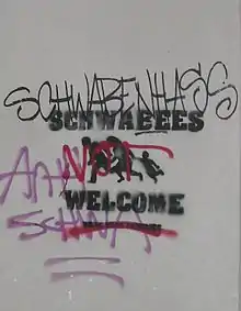 Prenzlauer Berg slogans included snowclones such as „Schwaben töten“ (Kill Swabians), „Wir sind ein Volk. Und ihr seid ein anderes“ (We're one people. And you are another.) or „Ostberlin wünscht dir eine gute Heimfahrt“ (East Berlin wishes you a good trip home).[23][24] The police started acting after „Kauft nicht bei Schwab'n“ (don't buy Swabian, a snowclone on a well-known antisemitic motto) was used as graffiti in Berlin's Rykestrasse.[25]