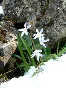 S. nana subsp. albescens (synonym S. albescens) is recognized by some sources, although not by others. It has slightly smaller flowers (tepals up to 1 cm long), whitish with lavender to violet-blue tips.[5] It was awarded the RHS Award of Garden Merit (H4 – hardy outdoors anywhere in the British Isles) in 2004, subject to availability.[6]