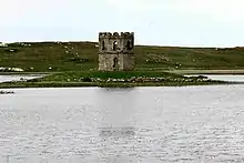 It was built in about 1830 by Dr Alexander MacLeod, who was the factor of the North Uist estate.[2] It was erected to provide employment for the purpose of famine relief. Built over an Iron Age dun on a small islet in Loch Scolpaig, the Gothic-style folly has an octagonal footprint and appears as a two-storey structure surmounted by a crenellated parapet. The tower is surrounded by a low stone wall that was probably constructed at the same time. The original dun has disappeared entirely. Today the tower is open to the elements and serves as a nesting place for birds.