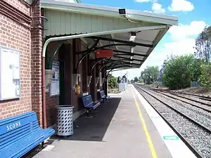 The station has one platform and a passing loop. The original John Whitton 1871 brick building remains.[4] In June 2014 the layout was reconfigured with the former loop becoming the main line and the platform line the loop.[5]