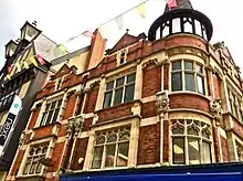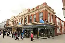 - 115 High Street, Lincoln.Corner of High St. with Gaunt St. 4 houses and shops. Eight bay block (at first floor level). Divided into four shops. Brick with limestone stringing . 4 pedimented gables and one gable to Gaunt Street. Cupola at corner.[9]