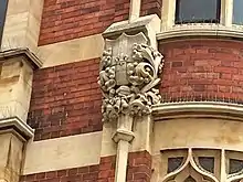 - 5-6 Bank Street, Lincoln. Offices for Page and Porter, Solicitors. 1898.[7] Tudor Revival. Two storeys with two bays with three lights and additional light over decorative doorway. Brick with ashlar stringing, base coursing and dressing. Arched doorway with Tudoresque foliage and grinning faces on at ends of stringcourse above.