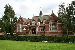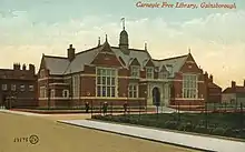 - Gainsborough Public Library. Cobden Street. 1905. Carnegie Library. Brick with stone dressings. Tudoresque with symmetrical front, projecting wings with large mullioned transomed windows. Central classical porch with coupled columns with a lantern over.[10]