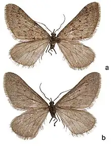 The wingspan is 28–33 mm. The ground colour of the forewings is pale greyish brown. The basal area and medial band slightly darker, edged with dark brown. The medial line is shadow like and poorly visible, and the median area is uniformly pale greyish brown. There is a small, blackish discal spot. The hindwings are cream brown with a small discal spot. Adults have been recorded on wing in late autumn.