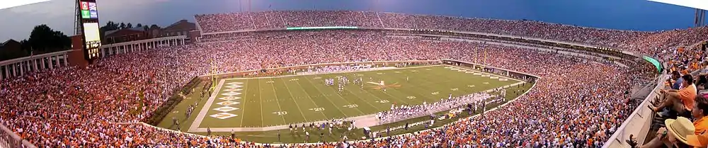 Built as a replacement for the old Lambeth Field or "Colonnades," Scott Stadium bears the name of donor and University Rector Frederic Scott, and held 25,000 spectators at opening. The stadium had a view of the Blue Ridge Mountains and specifically Monticello Mountain out the south end of the stadium. An artificial turf system was installed in 1974, making the long tradition of a mounted Cavalier riding into the stadium with the football team impossible. David A. Harrison III provided a gift allowing natural grass to be reinstalled in the stadium, and the Cavalier has ridden into Scott Stadium every game since 1995 accompanied by orange and blue fireworks.