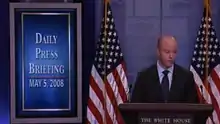 On November 29, 2006, Stanzel returned to the White House as deputy assistant to the president and deputy press secretary.[5] In this role, Stanzel served as a spokesman for Bush on a variety of issues, including homeland security, education, agriculture and energy. Stanzel conducted numerous on camera briefings in the James S. Brady Press Briefing Room and at the "Western White House" in Crawford, Texas. Stanzel regularly prepared Bush for media interviews and developed the strategy for the lengthy series of final interviews the president conducted over the last months of his time in office.