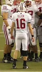 The winner of a spring quarterback competition, Tolzien beat out starter Sherer in 2009. He set the Wisconsin record for completions in a single season, with 211, and passed for 2,705 yards.[8] Under Tolzien's leadership, Wisconsin finished the season at 9–3.[9] He threw a pair of interceptions that were returned for touchdowns in a loss at Ohio State and threw three interceptions against Iowa the following week.[10][11] Despite this, Tolzien played well in games against Michigan, Minnesota, and Michigan State, and was named Big Ten Offensive Player of the Week for his efforts against Michigan State.[12][13][14]