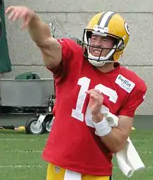 In his regular season debut, Tolzien completed 24-of-39 attempts for 280 yards, one touchdown and two interceptions in a 27–13 loss to the Philadelphia Eagles, earning him the start in the Packers' next game against the New York Giants.[34] Against the Giants, Tolzien was 24 of 34 and threw for 339 yards, but also threw 3 interceptions in a 27–13 loss.[35] The next week against the Vikings, Tolzien performed a spin move during a touchdown run before being relieved by quarterback Matt Flynn who led the Packers to a 26–26 tie against their divisional rival.[36][37][38]