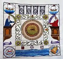 The first edition had only the initial 167 panels, the second edition was available from 31 May 2015 with all 305 panels.[30] A Double CD of Diaspora Music to accompany the project was produced by Greentrax Recordings.[31] A fascinating spin out book has now appeared from Rosemary Farmer & Maggie Ferguson, "The Art of Narrative Embroidery", which explores the many ways in which particular images have been stitched taking examples for both the Scottish Diaspora and the original Battle of Prestonpans tapestries.
