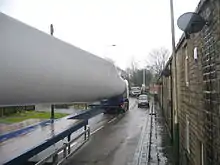 The detailed design for the project was completed during summer 2006 and construction began in January 2007.[25] The first task was to build a stable access road, but the moor was covered in a layer of peat with a low load-bearing capacity. The whole area had also been subjected to extensive coal mining during the 19th and early 20th centuries, so there was a potential for subsidence. To address these problems, the mining voids were grouted and a floating road was constructed, using a complex system of geotextiles and geogrids to prevent the road from sinking.[12] This was achieved by laying a crushed-gravel base, reinforced with polyester and polypropylene grids, to bridge any potential mine voids and ensure that the weak shear strength of the subsoil was exceeded by the base course material.[26] The wind turbines arrived at Scout Moor in parts, transported by large goods vehicles along the M66 motorway to Edenfield as part of a 76-day-long convoy of delivery.[27]