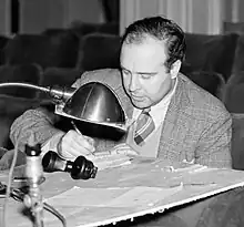 Welles and Mankiewicz soon settled on the idea of using newspaper magnate William Randolph Hearst as their central character.[10]:484 By late January their disagreements over plot details were more frequent and their collaboration less creative. "That's why I left him on his own, finally," Welles said later, "because we'd started to waste too much time haggling."[4]:54 In February 1940,[3]:444,448 Welles arranged a lunch at New York's 21 Club and persuaded Houseman to return to California. He was hired to supervise Mankiewicz as he put a rough draft on paper.[9]:185