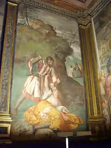 The Confraternity built the Scoletta in 1427 and it was expanded in 1504 with the Sala Priorale (Prior's Room) decorated with a cycle of fifteen frescoes and three canvases, which were worked on by the young Titian between 1510 and 1511. He was entrusted with three frescos of miracles performed by Anthony of Padua, The Miracle of the Newborn, The Miracle of the Healed Foot and The Miracle of the Jealous Husband. The three large frescoes were painted by him between April and December 1511 in the main room of the Scuola del Santo – they were is first large-scale independent work. The raised arm of the wife in Husband is sculpted in relief rather than painted illusionistically.[1]