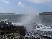 Many physical processes over ocean surface can generate sea salt aerosols. One common cause is the bursting of air bubbles, which are entrained by the wind stress during the whitecap formation. Another is tearing of drops from wave tops.[3] Wind speed is the key factor to determine the production rate in both mechanisms. Sea salt particle number concentration can reach 50 cm−3 or more with high winds (>10 m s−1), compared to ~10 cm−3 or less under moderate wind regimes.[3] Due to the dependence on wind speed, it could be expected that sea-salt particle production and its impacts on climate may vary with climate change.