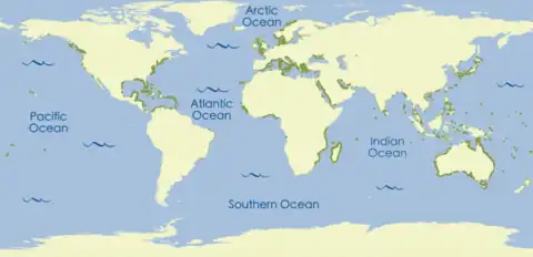 Seagrass meadows are found in the shallow seas of the continental shelves of all continents except Antarctica. Continental shelves are underwater areas of land surrounding each continent, creating areas of relatively shallow water known as shelf seas.[12] The grasses live in areas with soft sediment that are either intertidal (uncovered daily by seawater, as the tide goes in and out) or subtidal (always under the water). They prefer sheltered places, such as shallow bays, lagoons, and estuaries (sheltered areas where rivers flow in to the sea), where waves are limited and light and nutrient levels are high.