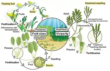 Species from the genera Amphibolis and Thalassodendron produce viviparous seedlings.[80] Most others produce seeds, although their characteristics vary widely;[81] some species produce seeds or fruit that are positively buoyant and have potential for long-distance dispersal (e.g., Enhalus, Posidonia, and Thalassia). Others produce seeds that are negatively buoyant with limited dispersal potential (e.g., Zostera and Halophila).[56][81] although long-distance dispersal can still occur via transport of detached fragments carrying spathes (modified leaves which enclose the flower cluster); e.g., Zostera spp.[82] Nearly all species are also capable of asexual reproduction through rhizome elongation [83] or the production of asexual fragments (e.g., rhizome fragments, pseudoviviparous plantlets).[84][85] Sexually derived propagules of some species lack the ability to be dormant (e.g., Amphibolis and Posidonia), while others can remain dormant for long periods.[86][87] These differences in biology and ecology of propagules strongly influence patterns of recruitment and dispersal, and the way they can be used effectively in restoration.[79]