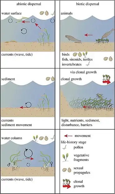 - ↑ Sumoski, SE; Orth, RJ (2012). "Biotic dispersal in eelgrass Zostera marina". Marine Ecology Progress Series. 471: 1–10. Bibcode:2012MEPS..471....1S. doi:10.3354/meps10145.