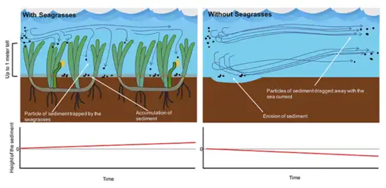 The diagram on the left above illustrates how seagrasses help trap sediment particles transported by sea currents. The leaves, extending toward the sea surface, slow down the water currents. The slower current is not able to carry the particles of sediment, so the particles drop down and become part of the seafloor, eventually building it up. When seagrasses are not present, the sea current has no obstacles and carries the sediment particles away, lifting them and eroding the seafloor.[3]