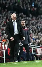 Dyche joined the England national under-21 football team as a temporary member of the backroom staff in September 2012,[13] but the following month became manager of Burnley, succeeding Eddie Howe, who had left the club to re-join Bournemouth.[14] Dyche was named Championship manager of the month for September 2013, and led Burnley to their best start to a season since they were founded in 1882. The team broke a number of long-standing club records, and won promotion to the Premier League, after a four-year absence.[15] Their spell in the top flight lasted only a single season, as they were relegated with two games to spare.[16] In February 2016, he signed a contract extension.[17] He guided Burnley to the Premier League for a second time in the 2015–16 season, with promotion sealed following a 1–0 win over Queens Park Rangers at Turf Moor on 2 May.[18]