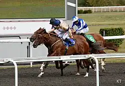 ![]() Levey riding Always Fearless at Kempton Park for owners King Power Racing (blue/white silks)[1] | |