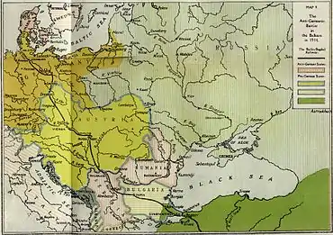 The cause of Bessarabia was championed by Arbore, who at the time rejected all notion that the region could ever witness a Russian devolution, and expressed distress that Romanian intellectuals were more interested in the fate of France than in the freedoms of Bessarabian Romanians.[95] Bogdan-Pitești's various articles also show his interest in the Bessarabian cause. Expressing regret that "most civilized" France stood by the world's "most savage, most ignorant and bloodiest oligarchy", "the Russia of pogroms and assassinations", he deemed Romania's overtures toward the Tsarist regime a "national crime".[96] Additionally, "Dodan" suggested that Austria-Hungary was preferable as a friend, as Romania's only guarantee against the "Slavic deluge".[86] Later, he argued that the cause of Transylvania was settled by, and within, Austria-Hungary. He mapped out an alternative strategy: neutral until the end of the war, Romania would eventually march its troops into Bessarabia, with Austrian acquiescence.[97] In October 1915, Aderca added his voice to the Bessarabian chorus. He postulated that the Transylvanian cause was doomed, and, since the Germans were poised to win the war, constituted "a union of the losers"; instead, he urged Romania to take Bessarabia as the spoils of war.[98] Karnabatt's own articles began by stating a minimalist objective in "the reincorporation of Bessarabia". Later, he advocated the extension of Romanian territory eastward, into Transnistria and down to the Dnieper River (as counterbalance to a foreseeable Greater Bulgaria).[80]