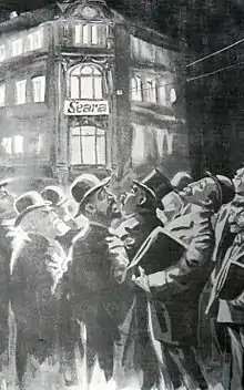 In autumn 1914, Seara and Minerva were both purchased by a German consortium, although Bogdan-Pitești was probably still the former's (uncredited) manager.[71] The two papers were brought under a single umbrella, the publishing house Tiparul. Its board of directors included Bogdan-Pitești, publicist Josef B. Brociner, banker Roselius, and investor Josef Hennenvogel.[72] The acquisition, which reputedly followed an increase in German propaganda and espionage all over Romania,[73] was described as scandalous by Acțiunea, an Ententist newspaper owned by Take Ionescu. In a September 24 piece called La mezat ("On Public Sale"), it claimed that Minerva cost the Germans 3 million lei, and Seara only 400,000 lei.[61] This allegation was confirmed during later inquiries.[74]